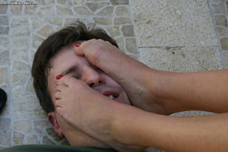 Slave matt's strength is being tested by having to wear a very heavy wooden stocks around his neck all day. Princess Kayla makes his position even harder by mocking him, pushing down on the stocks with her foor and making him reposition himself so he can worship the soles of her feet