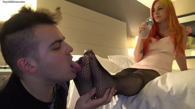 First time on the site for stunning Mistress Lilith. She sips her water and ignores the slave who is worshiping her fishnet stockings.