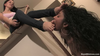 Video clip: Fawn wakes up in the middle of the night and is startled by the sight of her cousin kneeling at the foot of her bed and licking her feet. She quickly realizes that rather than being angry she can turn the situation in her favor by blackmailing him into becoming her slave.